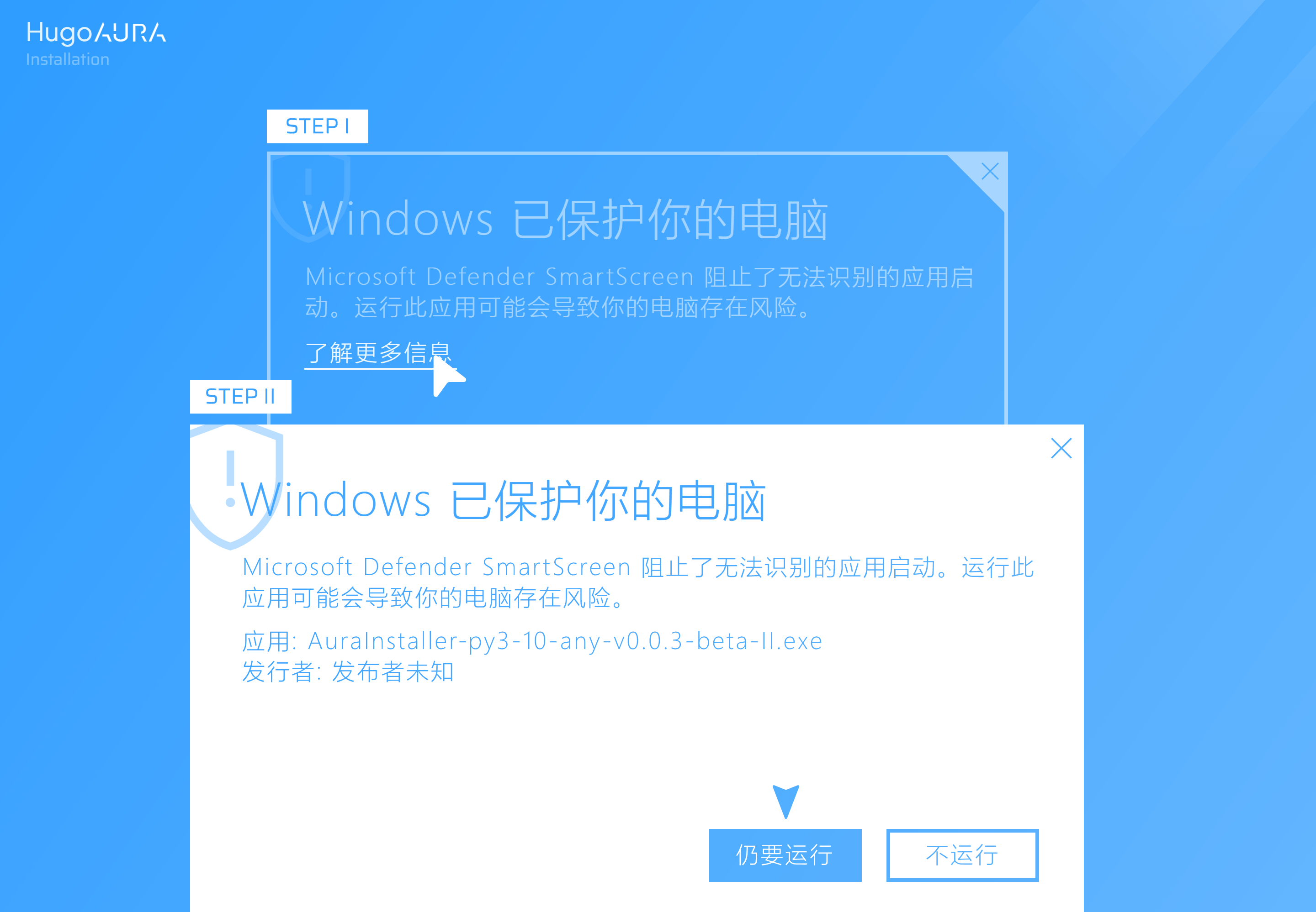 双击启动 HugoAura Install 安装器的 EXE。如果您遇到了 SmartScreen 警告弹窗, 请参见 解决 SmartScreen 警告。如果您遇到了 UAC 提示框, 请点击 "是"。