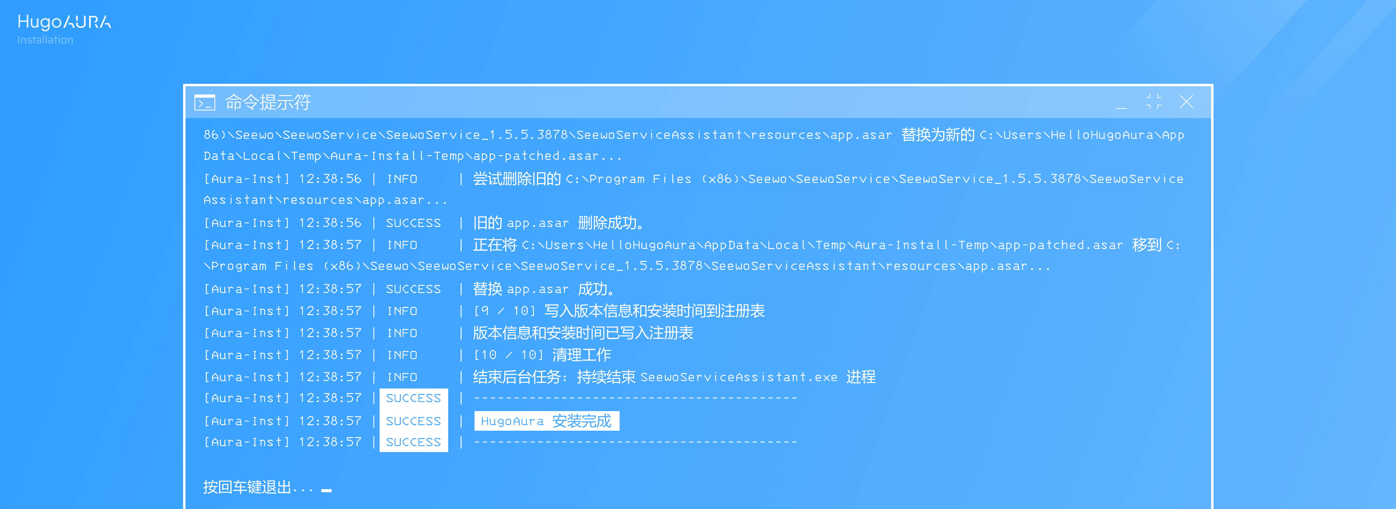回车提交后, HugoAura 将自动完成文件下载、ASAR 修补等操作。