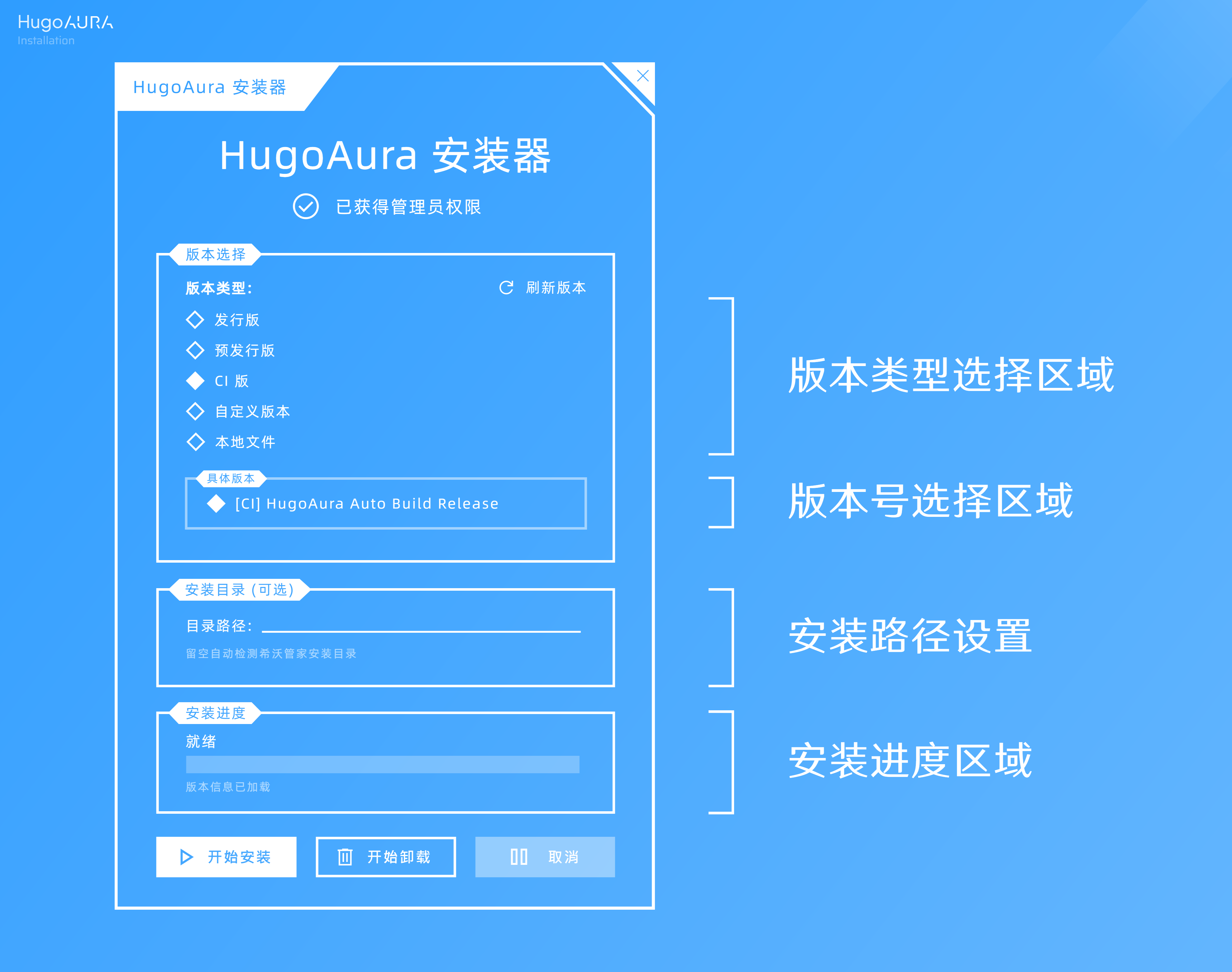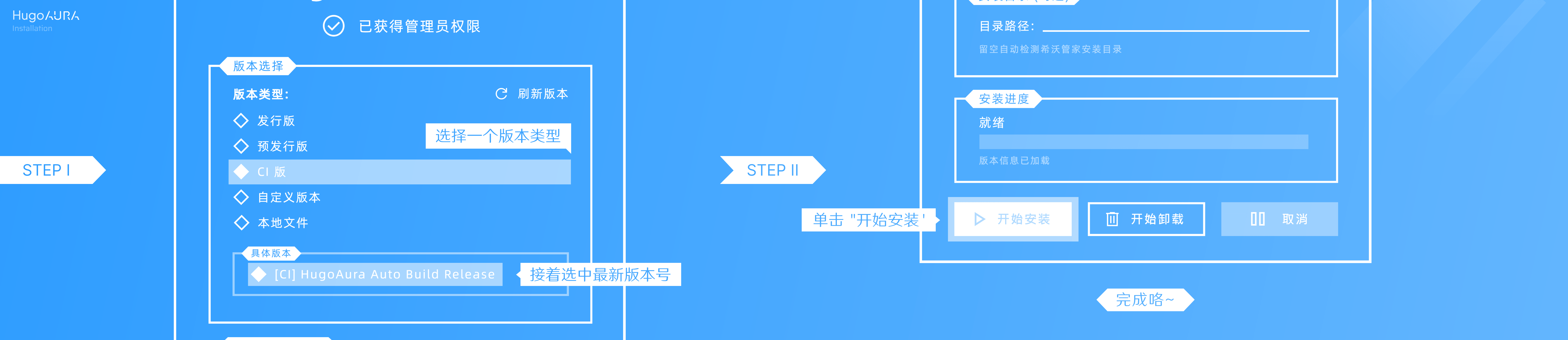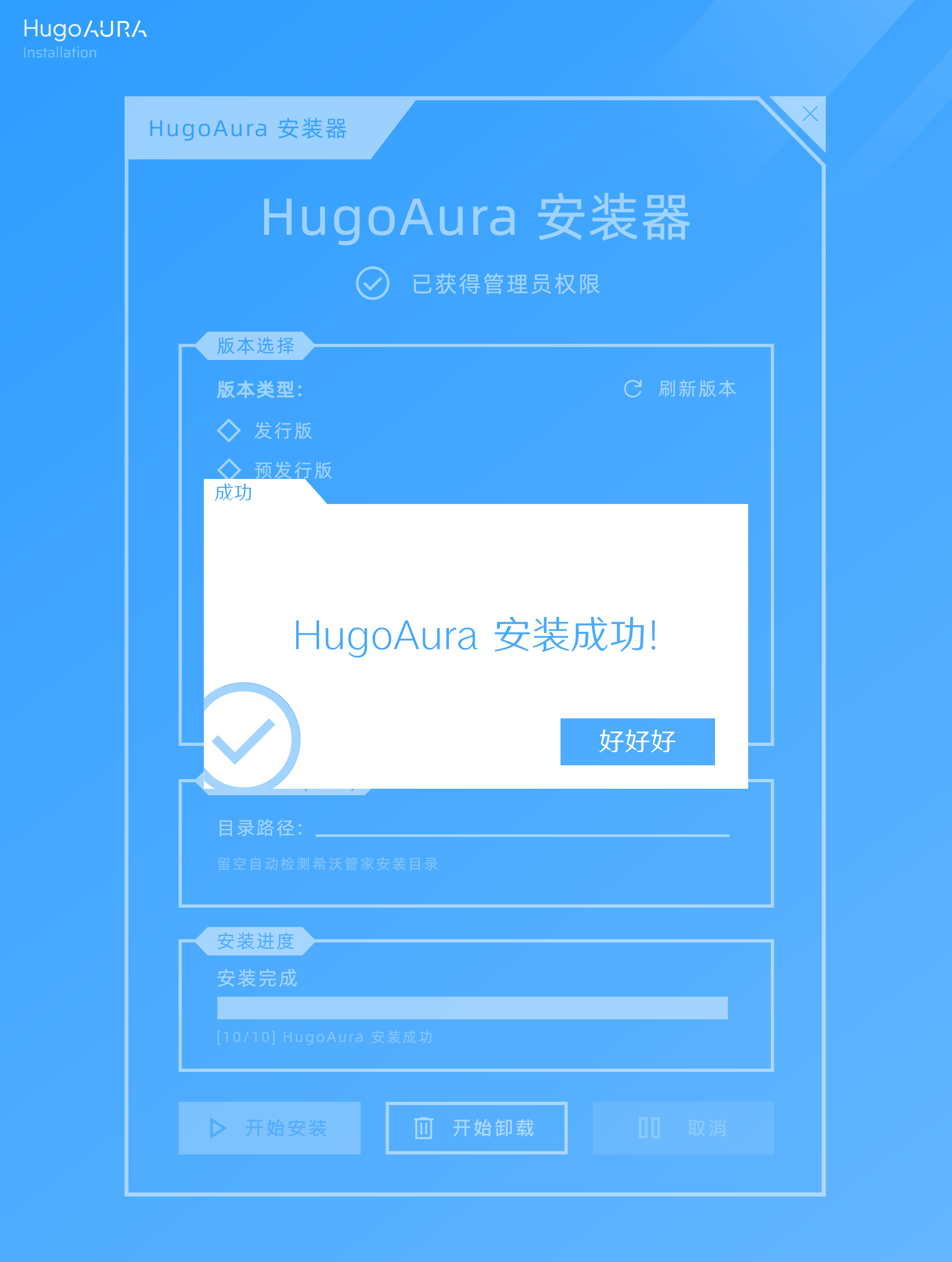 针对 Windows 10+ 用户, HugoAura Install 提供了友好的图形化界面供您执行操作。