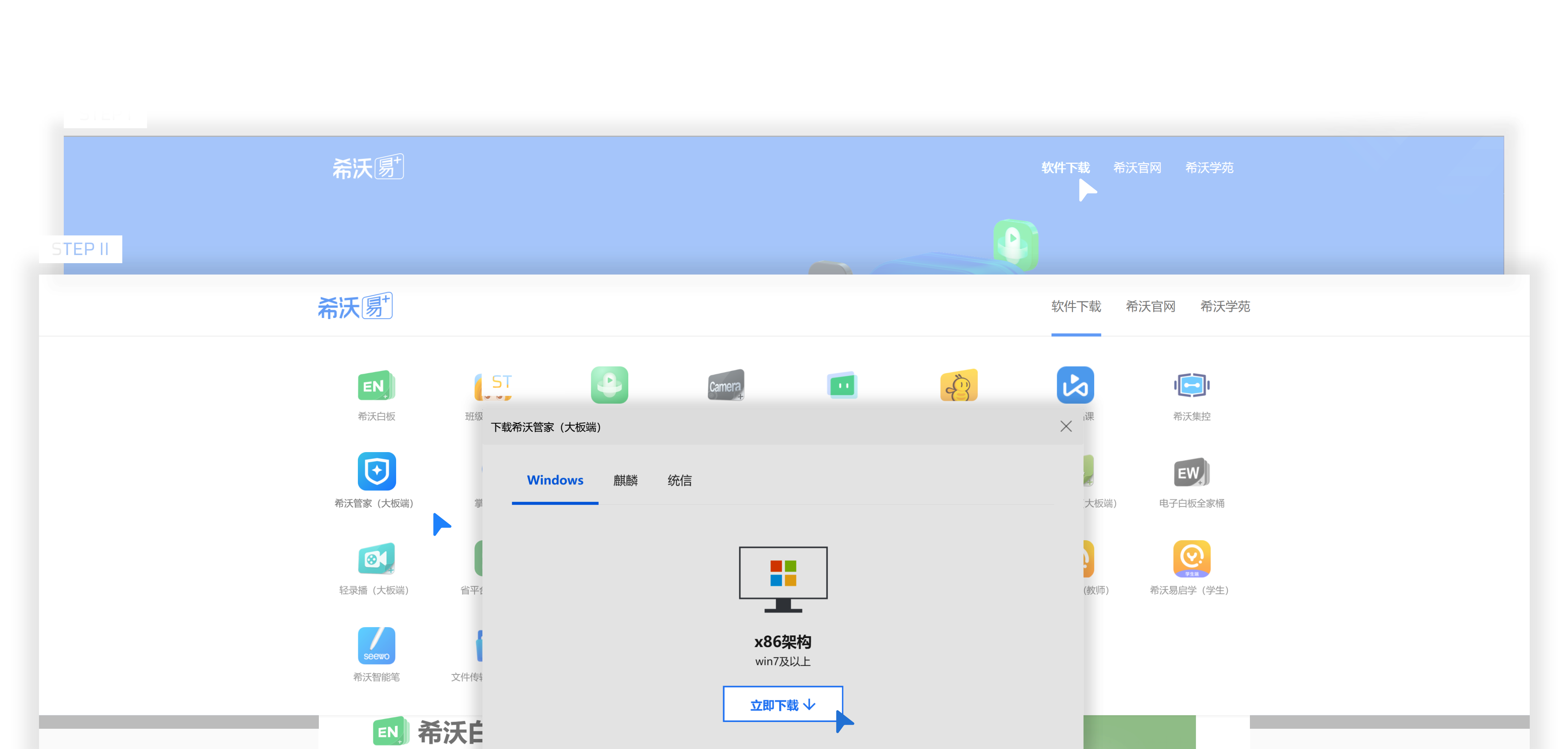 请打开 e.seewo.com, 接着按下图所示完成管家最新版下载。