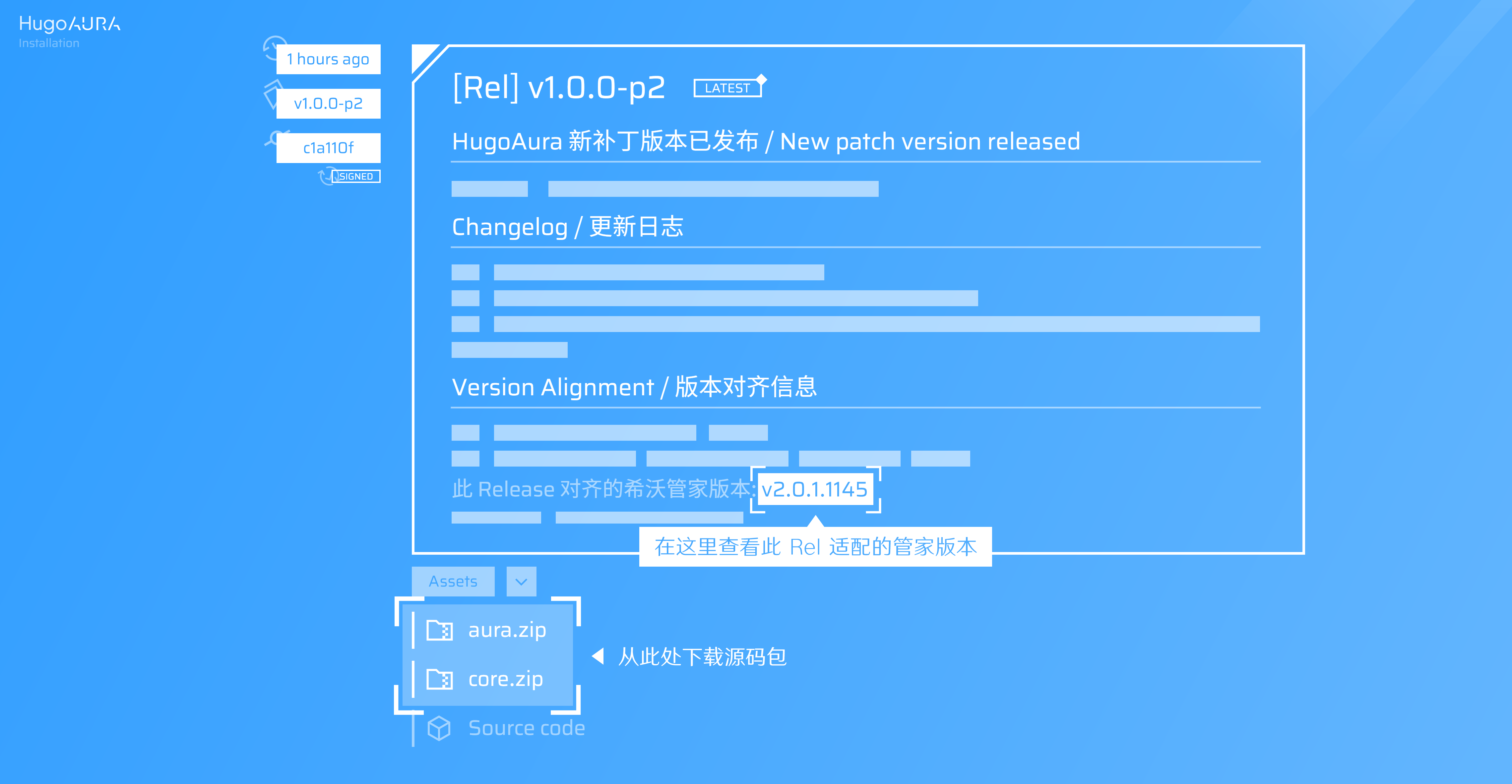 我们优先建议您下载 CI 版 的源码包。与一般软件不同, HugoAura-Main 的稳定版不一定能非常良好地兼容最新版管家。具体请详见每个 Release Description 区域的「版本对齐信息」。